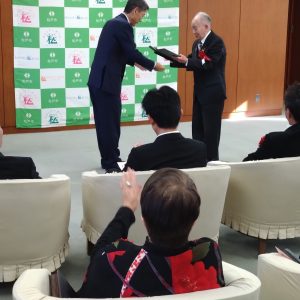 千葉前社長が本郷谷健次市長より、松戸市で歴代9人目となる『特別技能功労者(松戸マイスター)』の表彰を受ける。